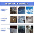 Glass repair kit can be applied to most types of double-layer laminated windshield damaged outer glass, cracks not exceeding 4 inches/10 cm and circulardamages not exceeding 1cm in diameter. It can effectively repair small debris, bullseye, spider webs, star and half crescent shapes.